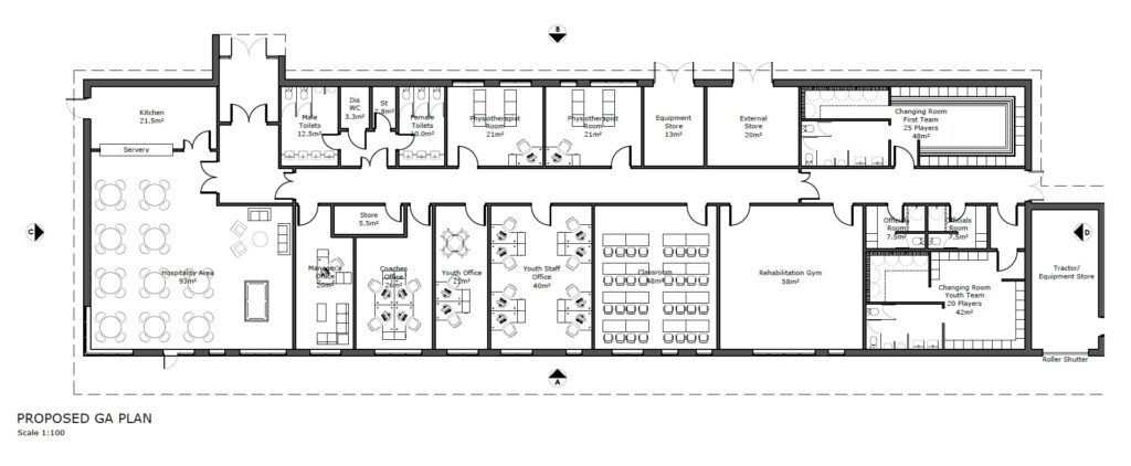The new training centre will include separate changing rooms for first team and youth players, physiotherapy and rehabilitation rooms to treat injured players, a classroom for academy players and a dining room for the team. Existing pitches will be retained in their current layout.