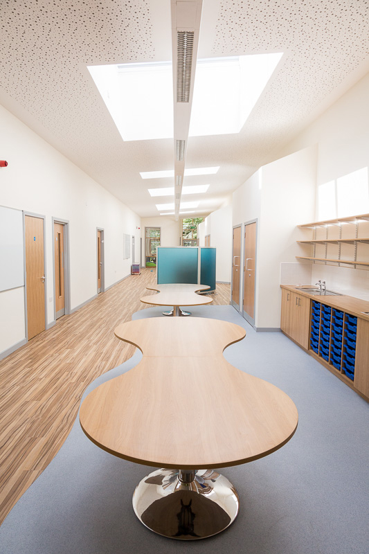 Natural light plays a key role throughout the new building with roof lights illuminating the large open resource spaces off classroom that avoiding the need for narrow corridors.