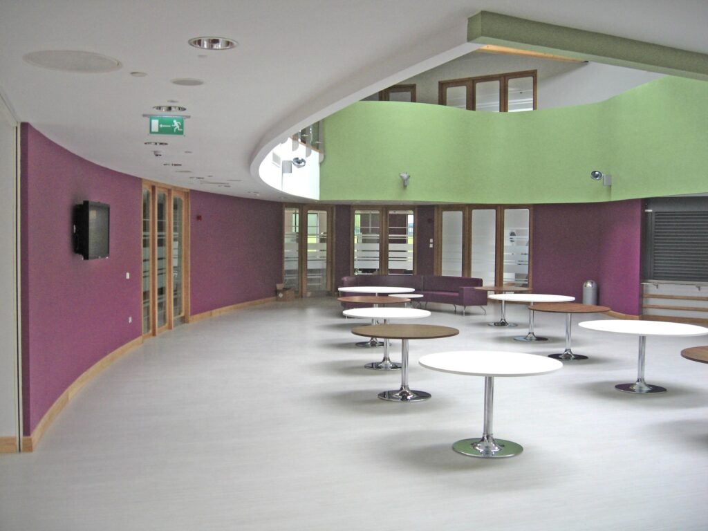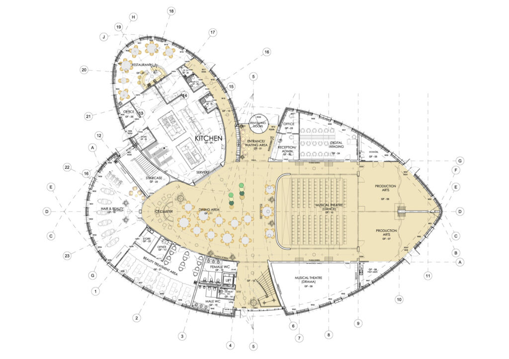 As flexibility and multi purpose space was a key requirement a central open plan space was created at the heart of the building allowing integration of the different vocational elements. This central hub could cater for lectures, performances, social gathering, eating/ dining space, learning space etc and would create a dynamic space acting as a focal point to the entire complex.