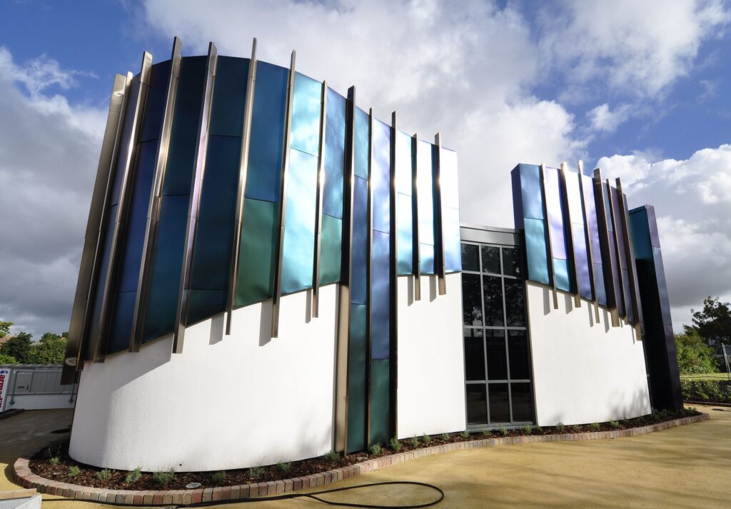 Lower panels of white render have been used to keep a clean modern look which help set off the vertical panels of metal cladding panels of the new extension. The Rimex Cladding System provides striking colour variations. The colours have been chosen to also help to link the building with the surrounding landscaping.