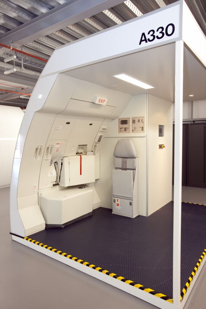 Within phase one facility are slide trainers for the A320, A330 and RJX aircraft; door and over-wing trainers; a B757 smoke trainer; and at first floor level are training rooms and a galley training room.
